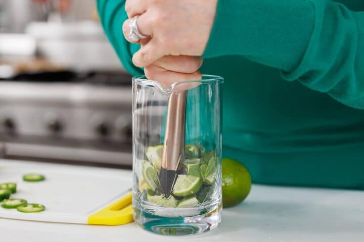 Step 2. Add lime slices, jalapeño, and mint sprigs to a pitcher. Then using a muddler or the end of a wooden spoon, muddle all of the ingredients together to release the flavors.