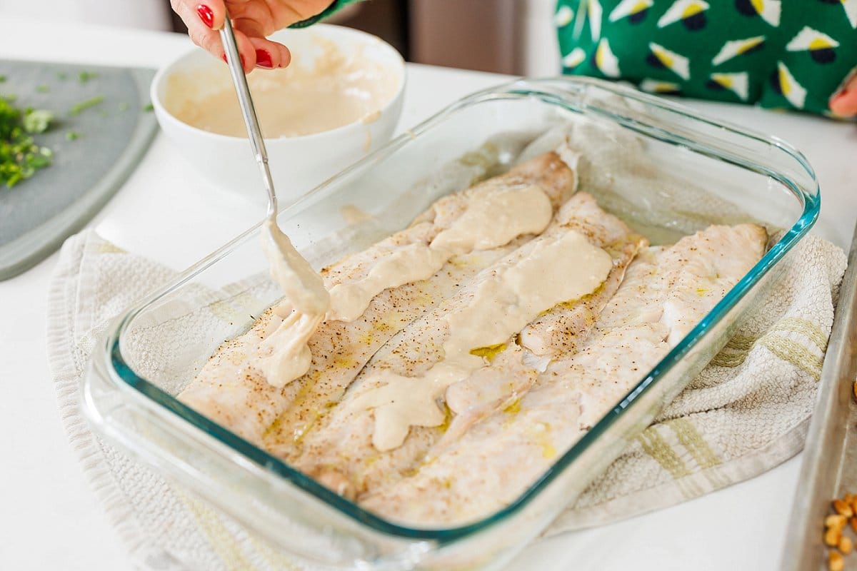 Start by cooking your fish. Pat them dry, and lay the fillets in a flat layer in a prepared baking dish.