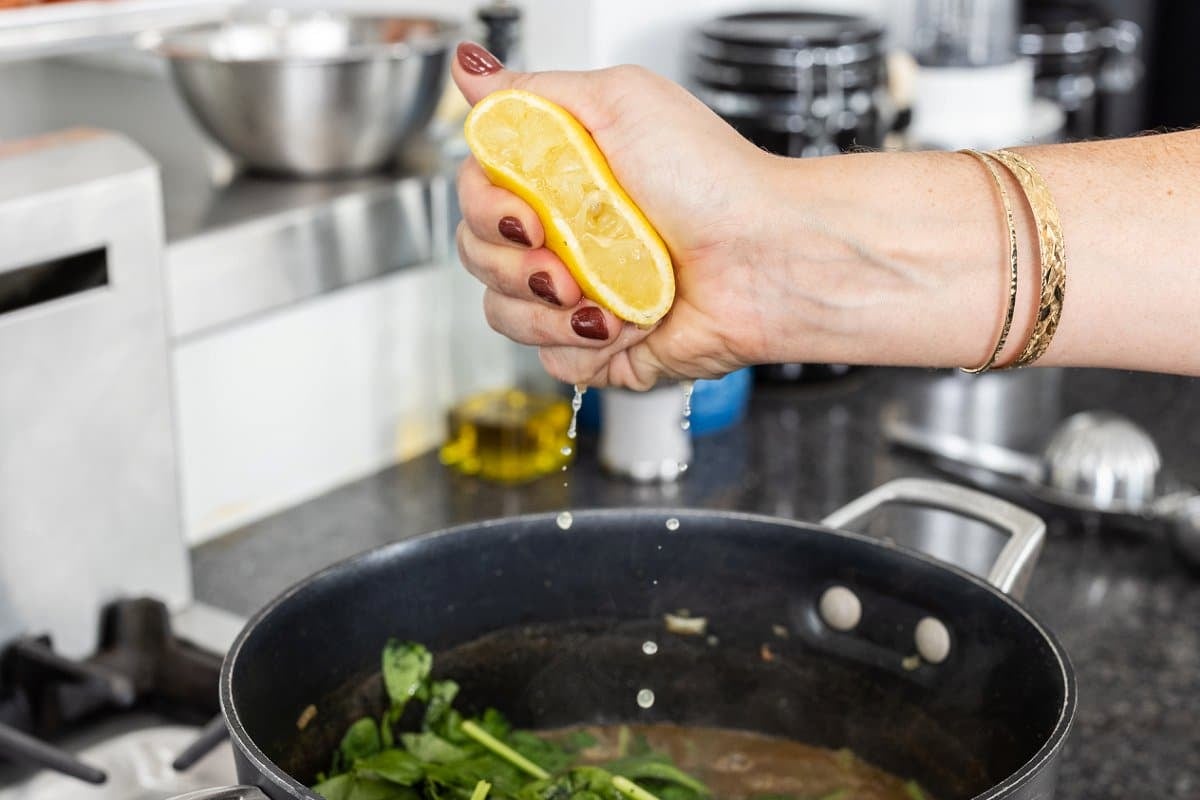 - Right before serving, stir in the spinach and cook until bright green and wilted, about 2 minutes. Season with additional, salt, pepper and lemon juice to taste before serving warm.