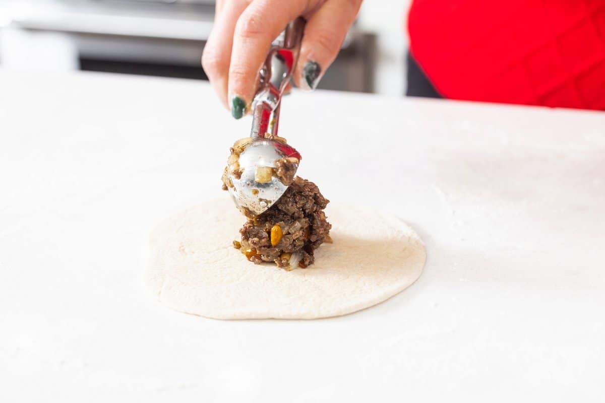 Then use either a tablespoon or a cookie dough scoop to put a dollop of the meat filling in the middle of your dough circle.
