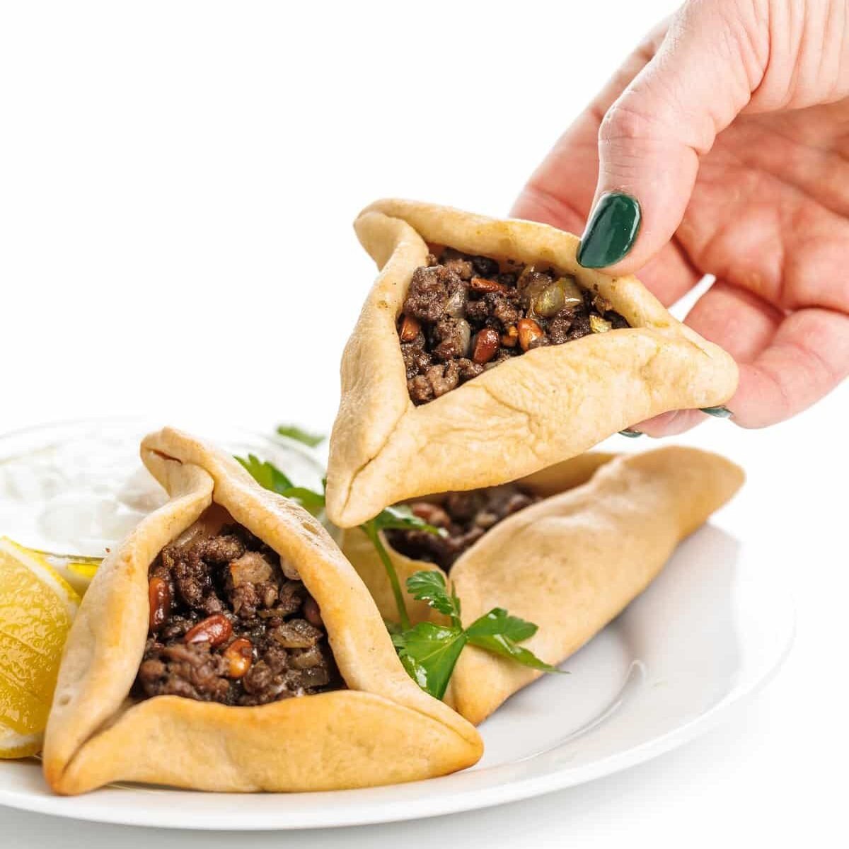 Meat pies are a very popular dish throughout the world. Whether it’s empanadas in Spain, patties in Jamaica, or pasties in Eastern Europe, it seems so many different cultures have their own version of a savory pie. In my family, we grew up eating sfeehas, also called fatayer. It’s a Middle Eastern meat pie that is filled with either meat and pine nuts, spinach, or cheese (such as feta.) Part of the Levantine cuisine, fatayer is eaten in Iraq, Syria, Egypt, Lebanon, Jordan, Palestine, and Israel. My Lebanese Meat Pies are filled with ground beef and pine nuts, and seasoned with warm spices.