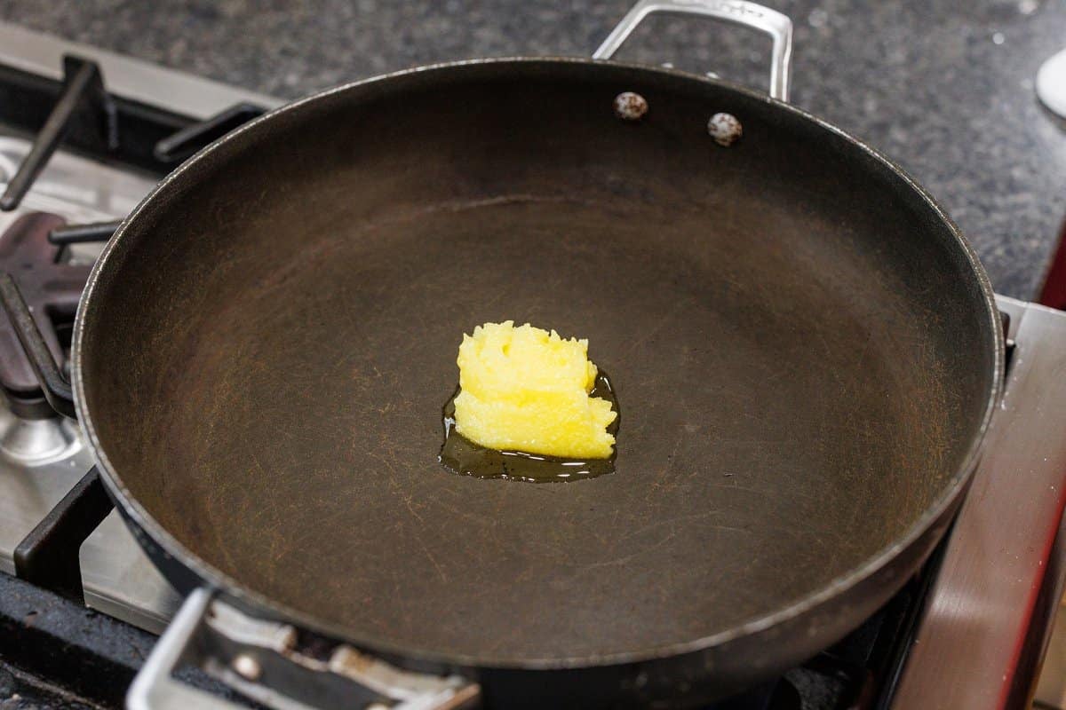 Start your Lebanese meat pies by dividing the bread dough and setting it aside. Then start making the filling by melting some ghee in a large skillet.