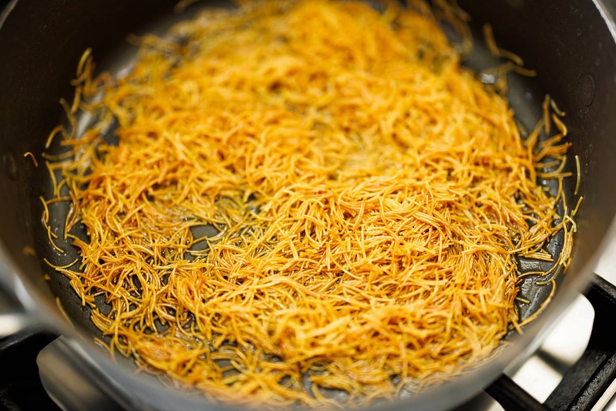 - In a large, deep pan heat the butter over medium heat until melted. Add the broken vermicelli pasta and brown, stirring frequently, until it is golden/dark brown. Be careful to not let burn – don't walk away from the pan. This takes about 4-5 minutes.