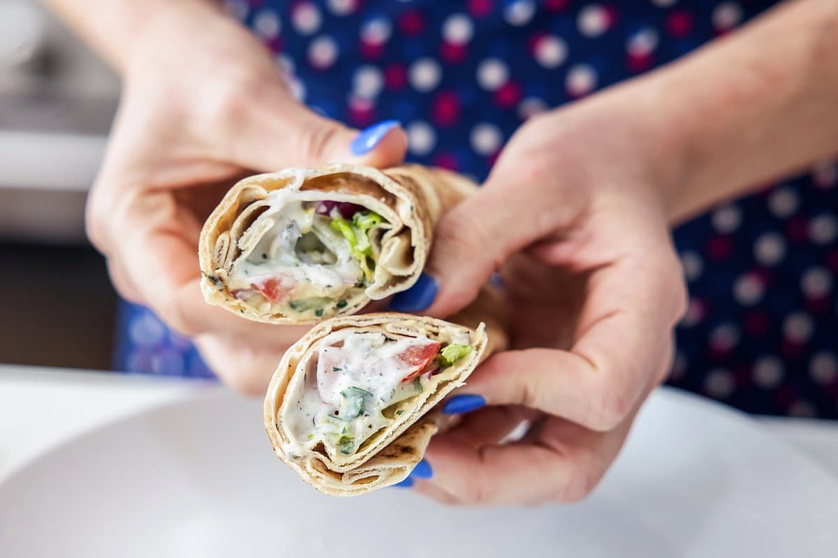 These Lebanese salad wraps are made with protein-packed hummus and creamy cucumber yogurt sauce. If you’re looking for new vegetarian lunch ideas, this recipe is for you.