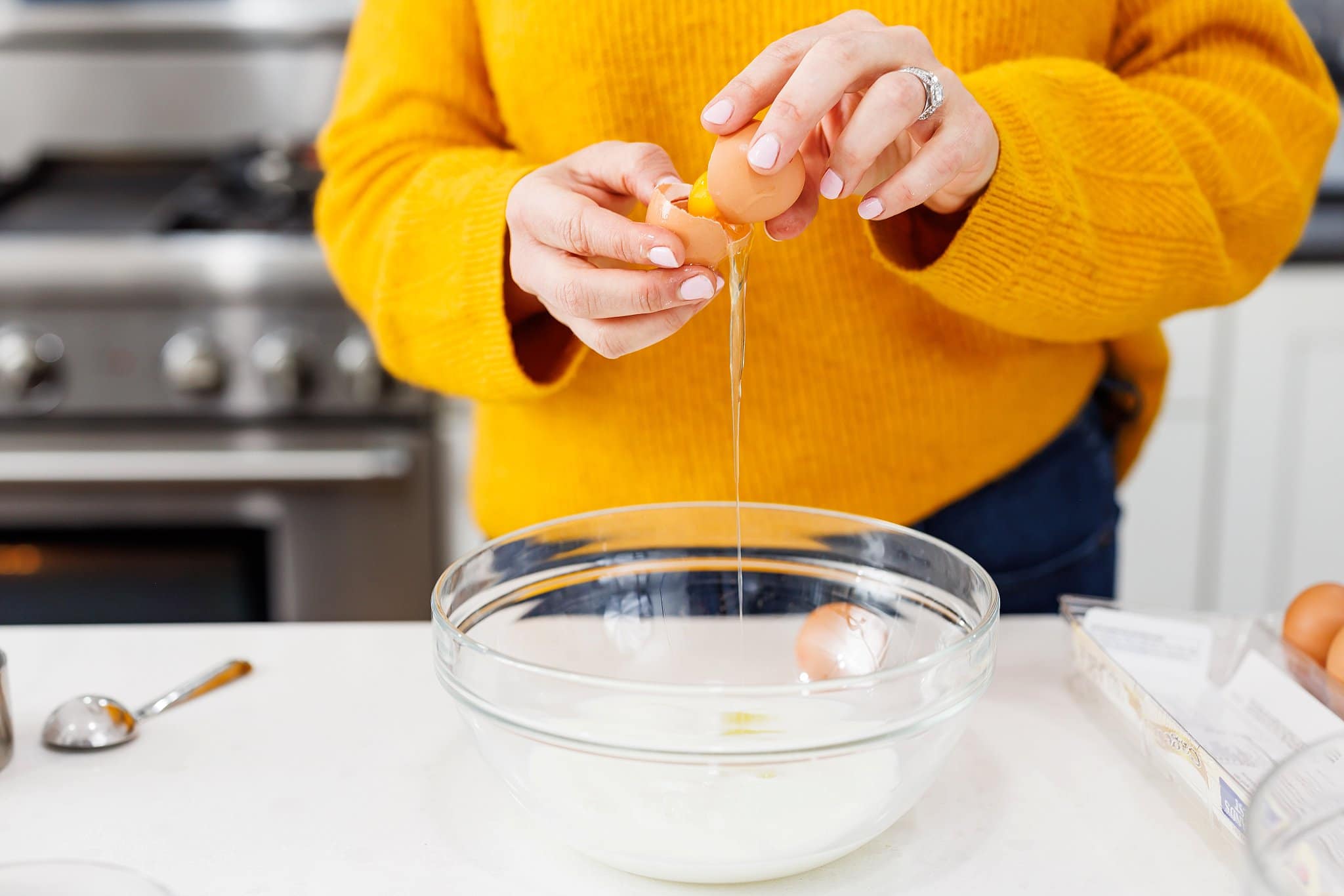 Then in another bowl, you’ll mix your dry ingredients. Start with your milk and yogurt, followed by the egg whites.