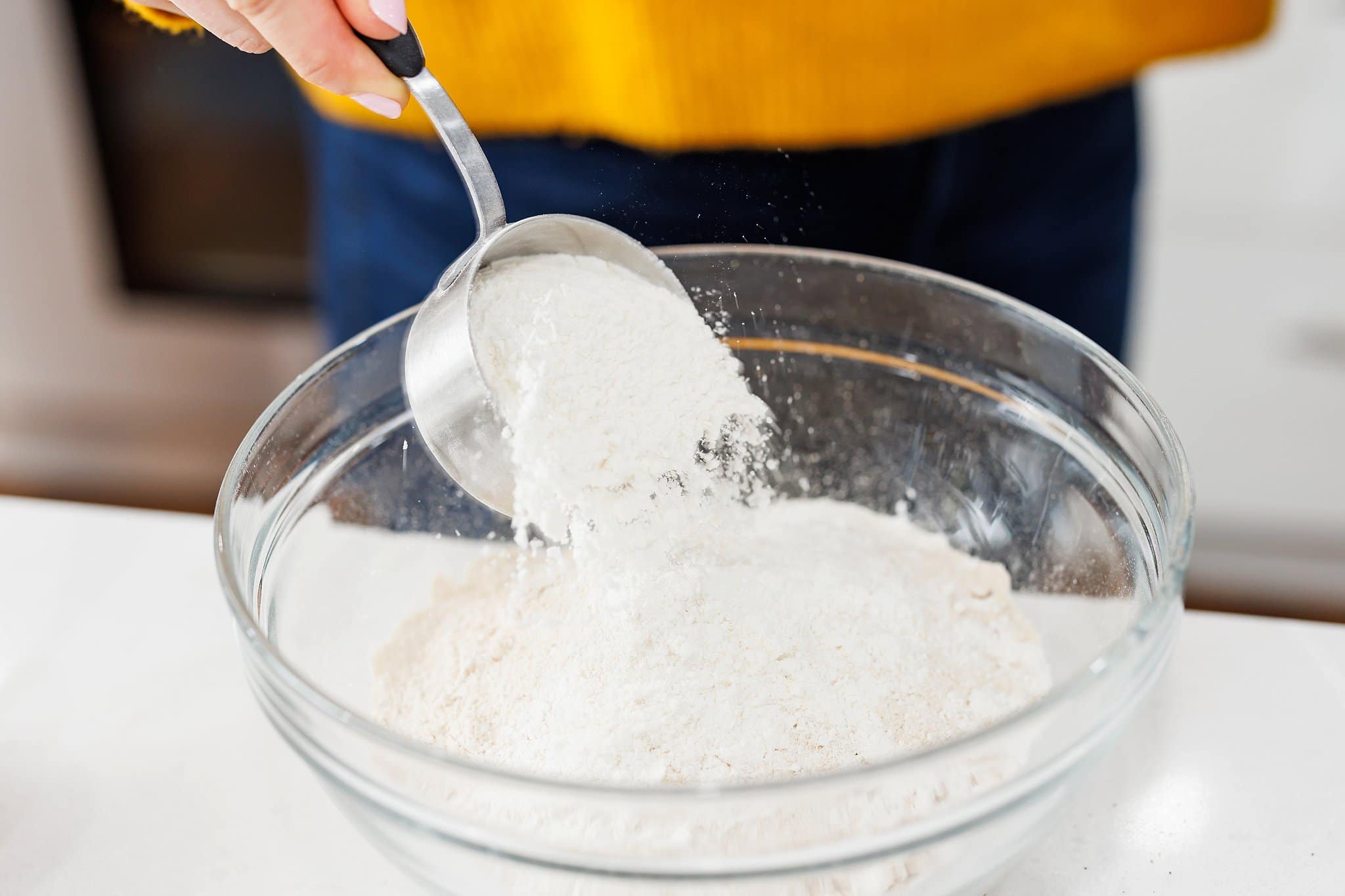 Next, you’ll mix your dry ingredients together. First you’ll measure out your white flour.
