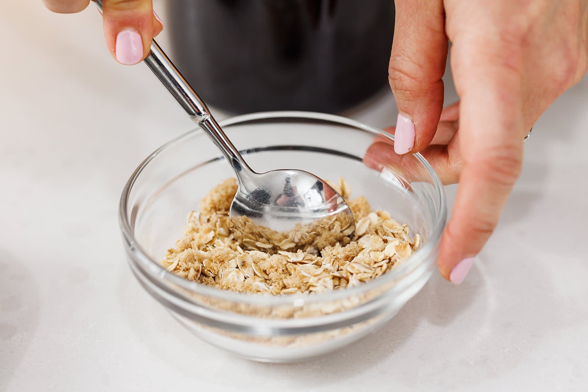 - In small bowl, combine 1/4 cup oats with brown sugar and set aside for topping.
