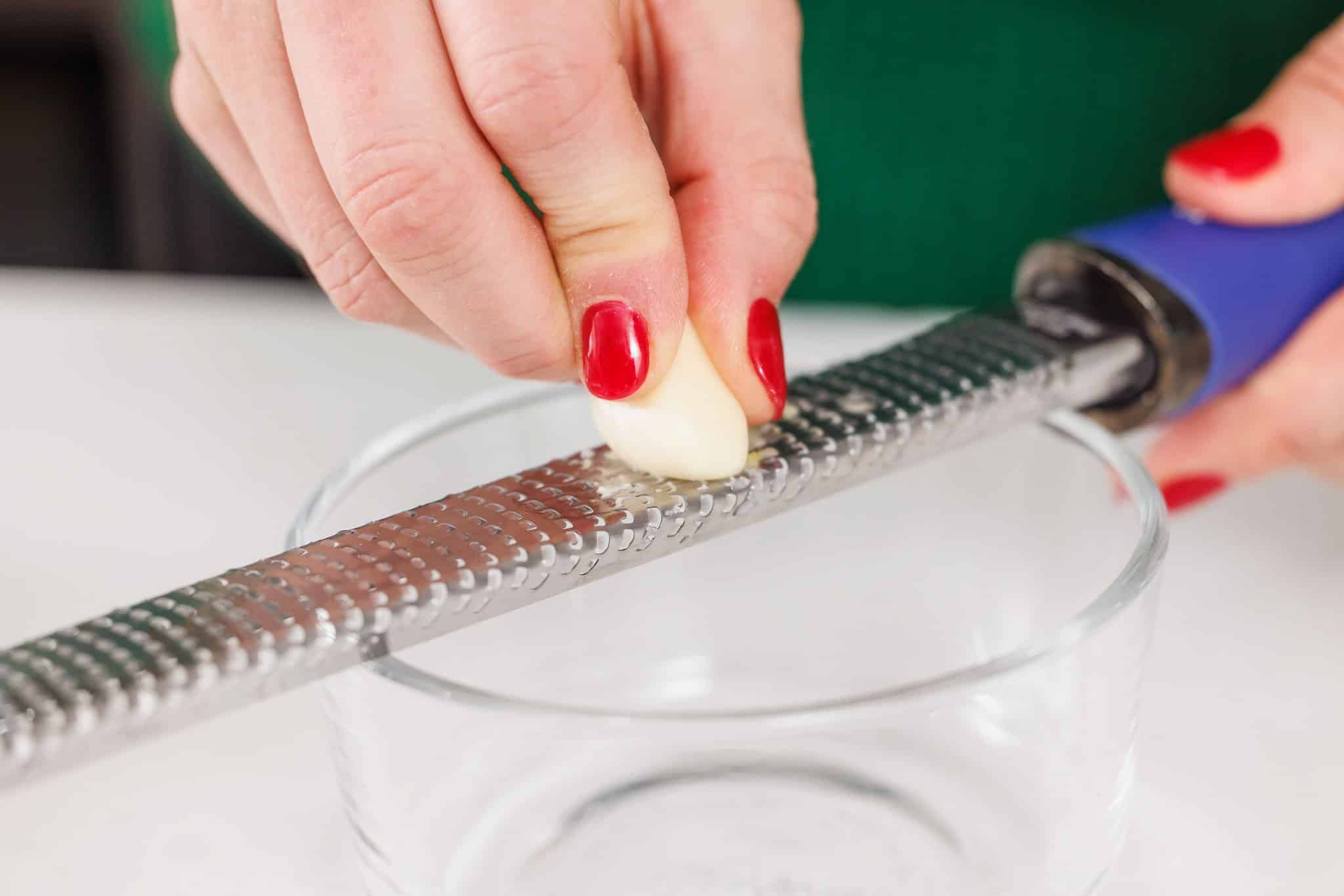 Start your baked lemon pepper chicken by making your simple spice rub. While you could use a store-bought lemon pepper seasoning, I prefer to make my own. In a small bowl, take a microplane and grate your garlic.