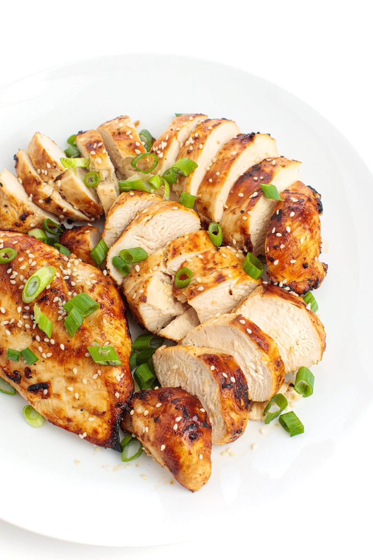 When chicken has reached an internal temp of 165 on a meat thermometer, you can remove it from the grill or oven. Garnish with some fresh scallions or sesame seeds, serve, and enjoy your Lemon Soy Marinated Chicken Breasts!