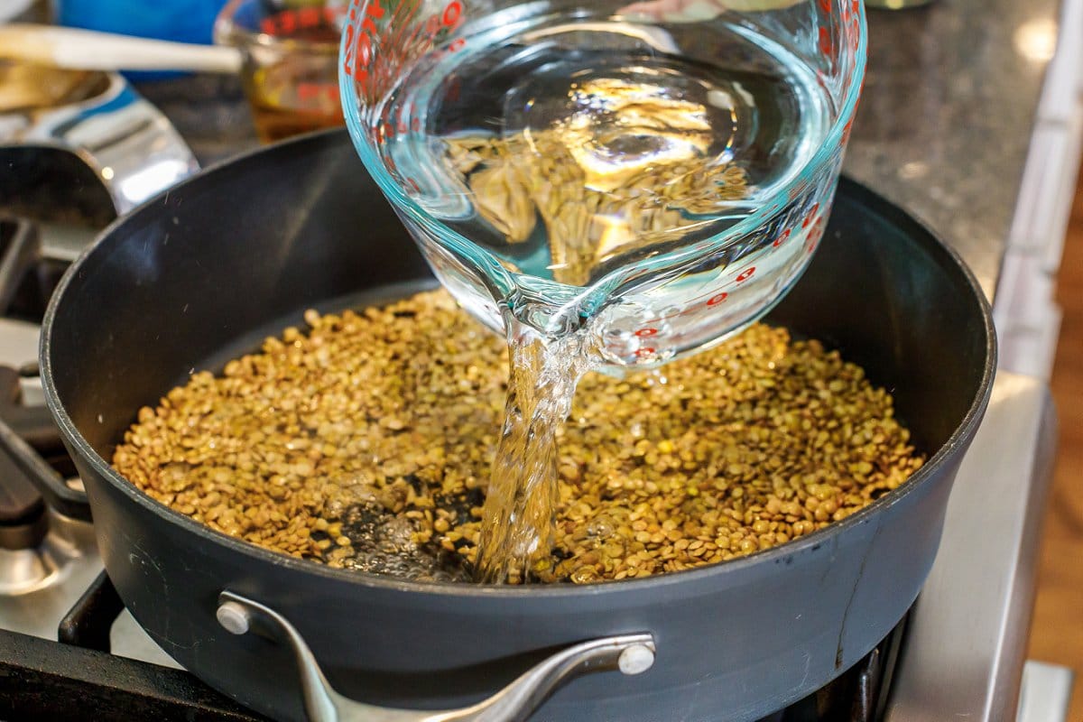 - Add lentils and water to the same pan and boil for 15 minutes, uncovered.