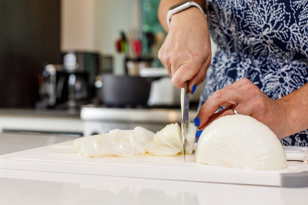 To start, you’ll want to pan-fry the onions in olive oil until they become caramelized and sweet.