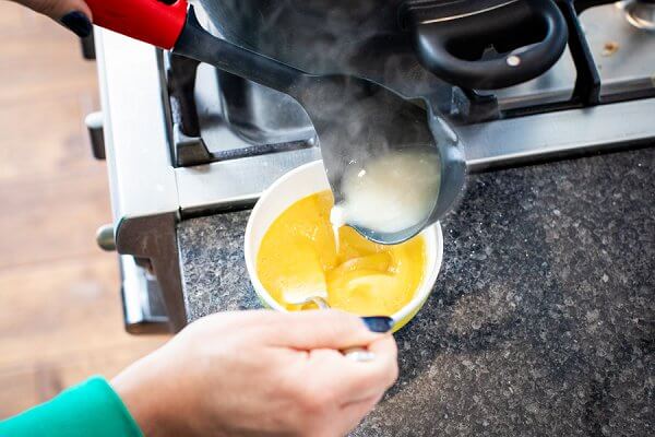 - To temper the eggs, slowly add the whisked eggs to the broth/cornstarch/lemon juice mixture. Whisk constantly so that the eggs gradually come to temperature. Continue until all of the eggs are fully incorporated.