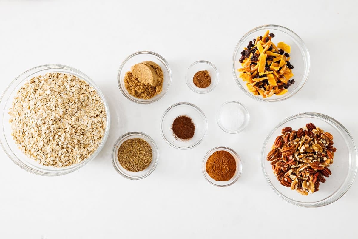 - In a large mixing bowl, combine all ingredients including toasted nuts. Store in an air-tight container for up to 3 weeks.8 cups old fashioned oats, 2 cups dried fruit, 1/2 cup brown sugar, 1/4 cup flax seed meal, 3 tablespoons cinnamon, 1 tablespoon salt, 1/2 tablespoon nutmeg, 1/4 tablespoon ground cloves