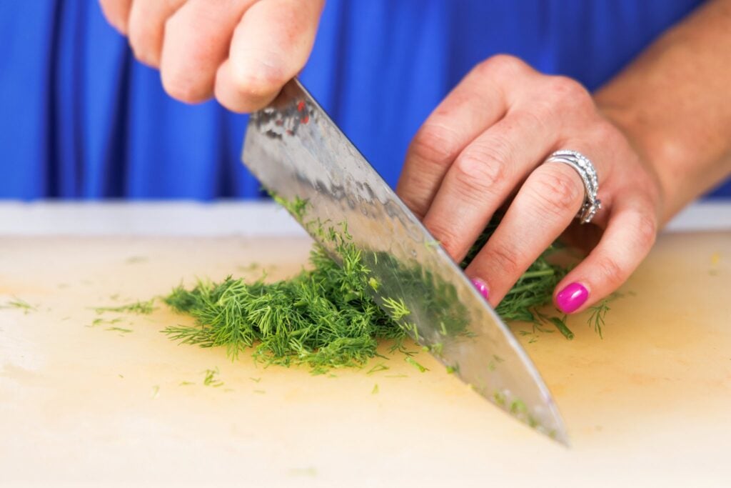 Step 6. Toss your sheet pan back into the oven for another 10-12 minutes. While the fish bakes, mince your fresh herbs.