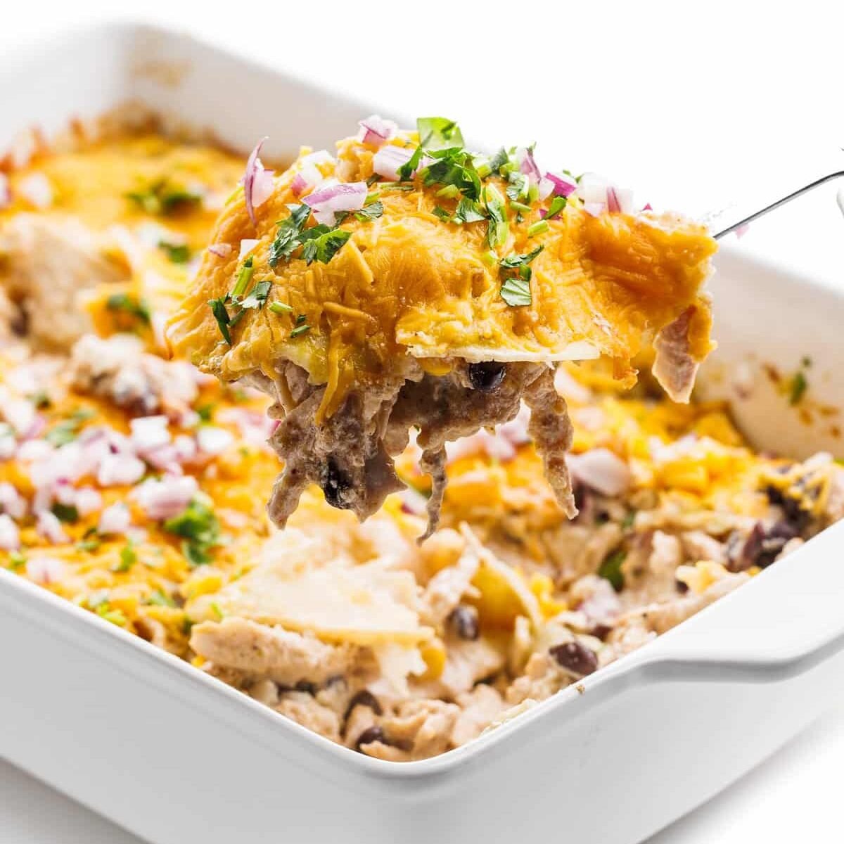 A fun spin on the traditional Italian dish, this naturally gluten-free cheesy Mexican lasagna recipe is made with shredded chicken, black beans, and corn.