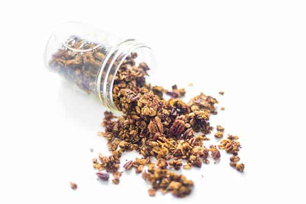 This molasses cookie granola recipe is made with hearty oats, crunchy pecans and warm spices like cinnamon, ginger and ground cloves.