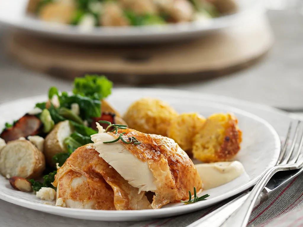 Paprika roast chicken with corn and polenta stuffing