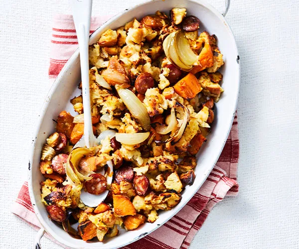 Stuffing is worthy of a dish of it’s own. This chorizo-onion pan version will perfectly complement your main meal.