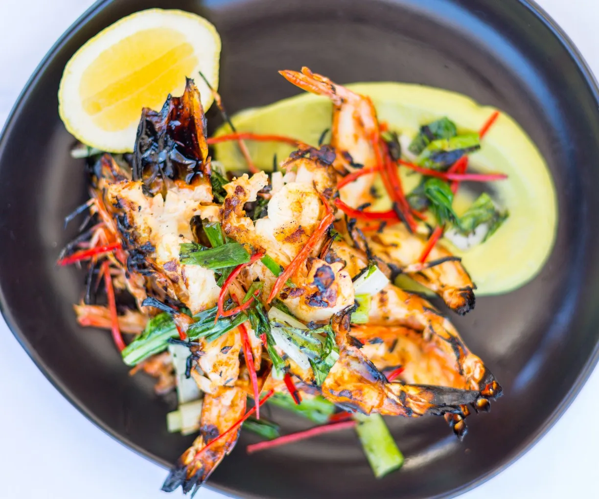 Wild chargrilled Skull Island Tiger Prawns with chilli and garlic oil, avocado mousse and charred greens