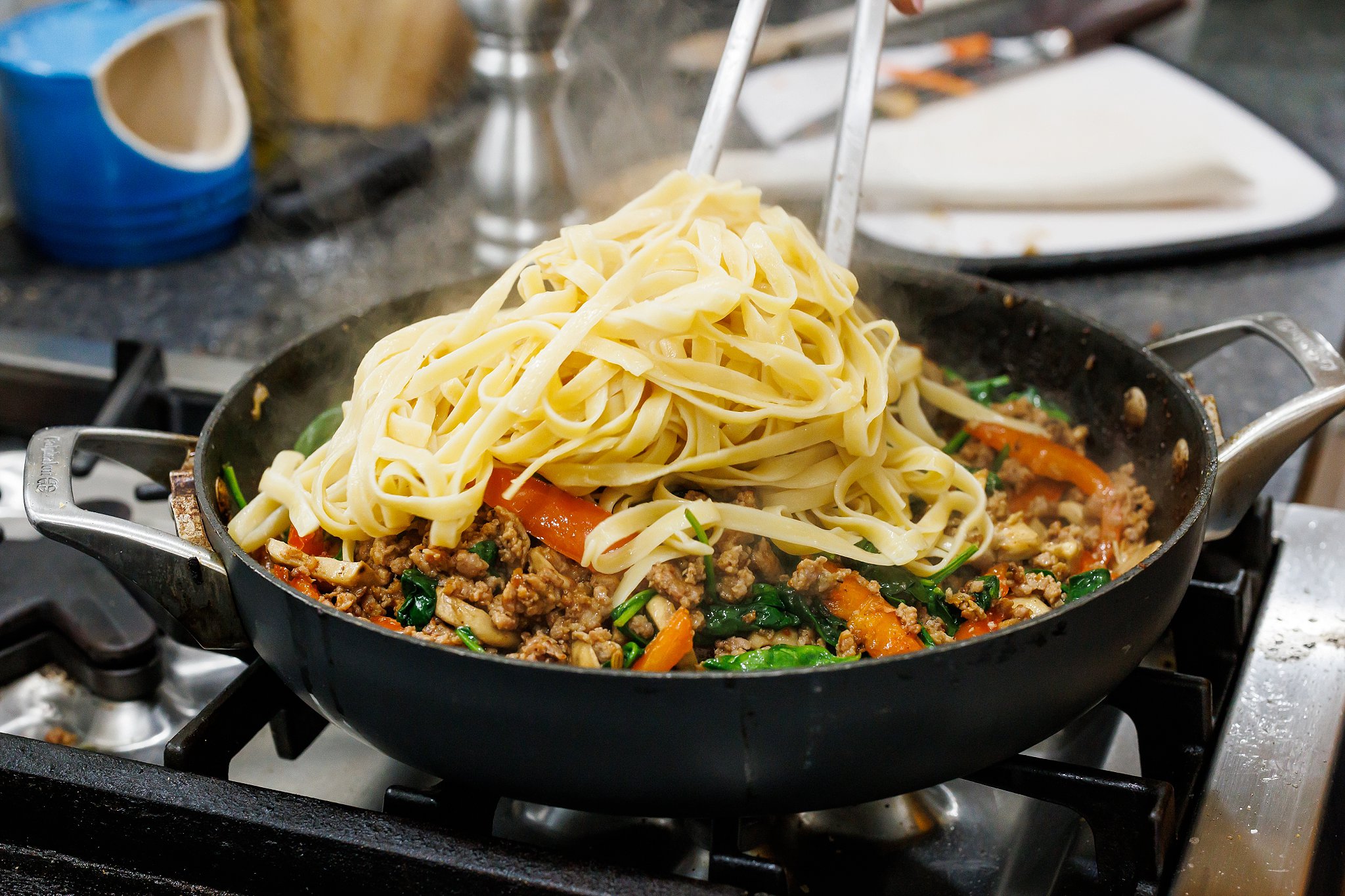 - Once browned, add reserved pasta cooking water and use a wooden spoon to break up the tasty bits from the bottom of the pan. Add pepper and sauté another 4-5 minutes.