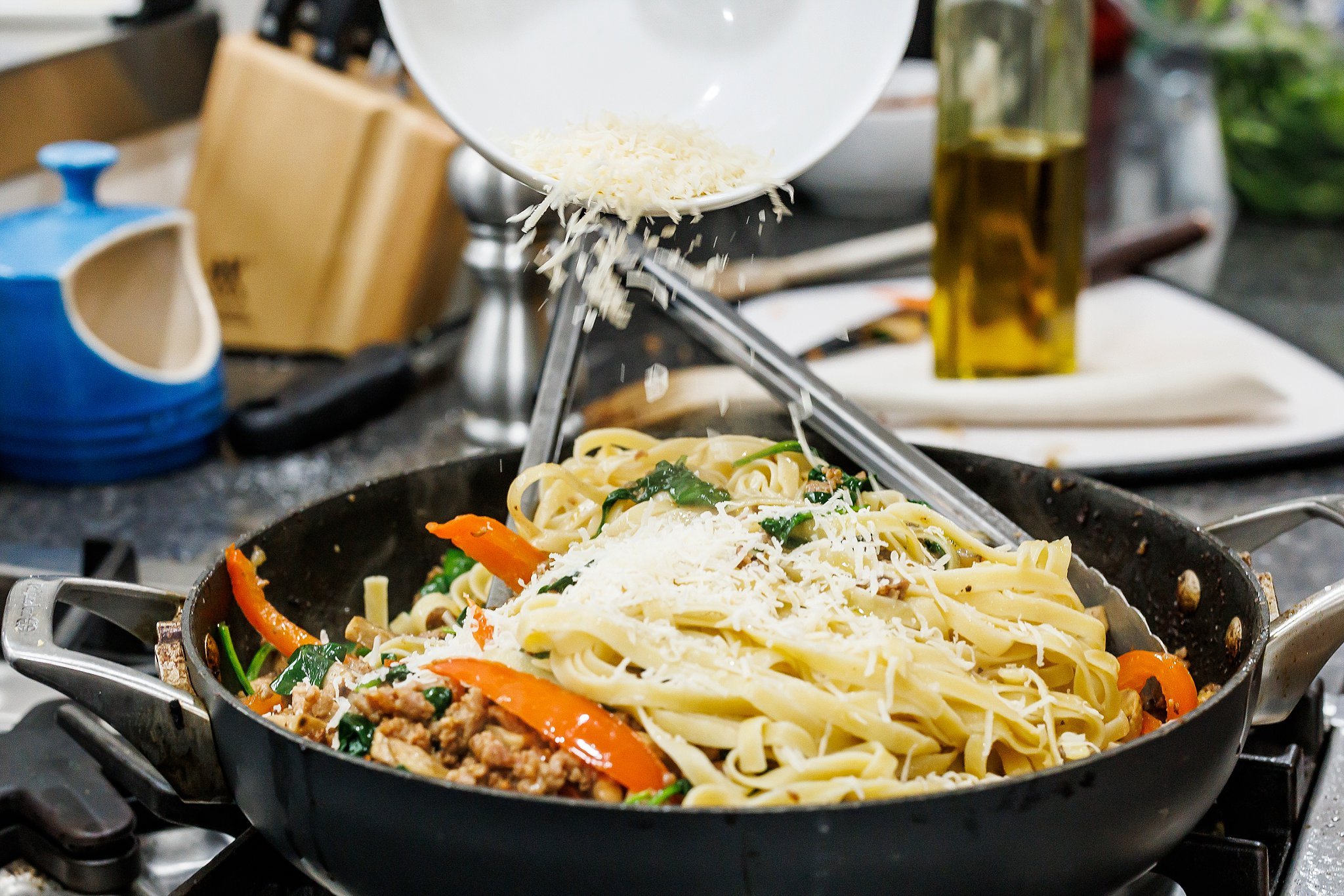 - Add mushrooms and spinach then cook another 4 minutes or until tender. Toss in parmesan cheese and the cooked pasta, then season with salt and pepper to taste.