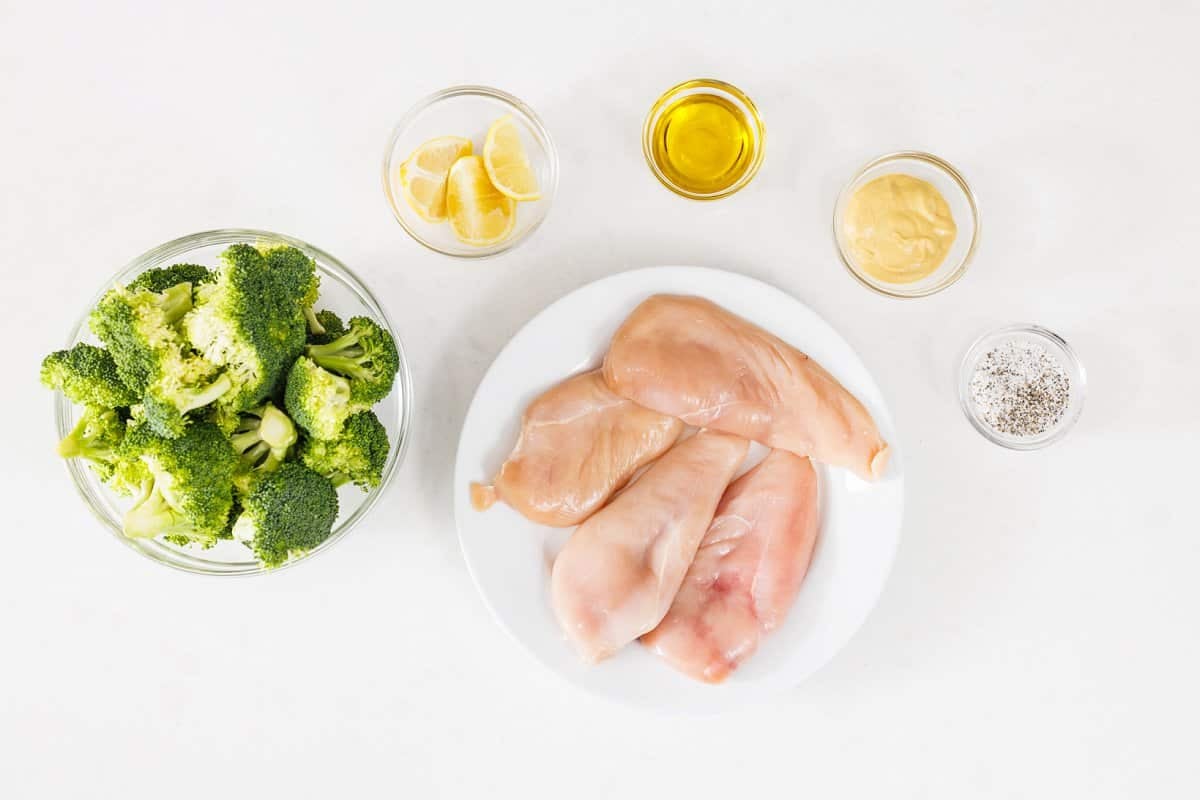 An easy one pan roasted chicken and broccoli dinner recipe made with boneless, skinless chicken breasts and brushed with Dijon mustard.