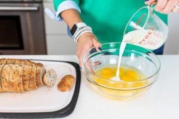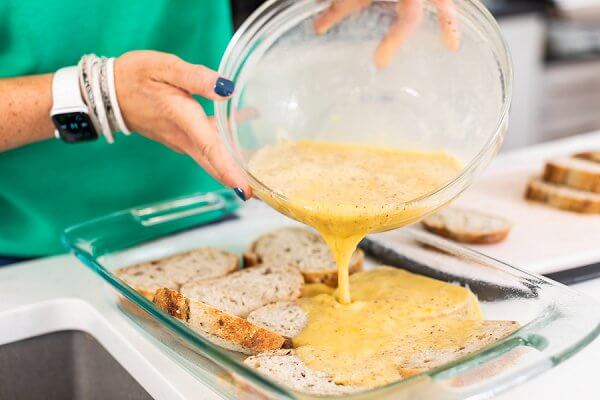 The recipe for a French toast bake is very customizable. To start, slice up any hearty bread you have on hand or find at the bakery. Pro Tip: This recipe is perfect for using leftover, stale bread. We love using hearty artisan whole wheat bread but use any bread you love most.
