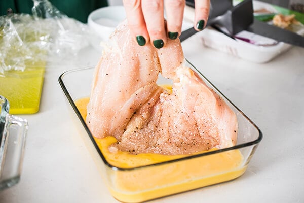 Of course, how you cut the chicken doesn’t matter but if you do keep the breasts whole, I suggest using a meat mallet to pound the chicken thin a bit.