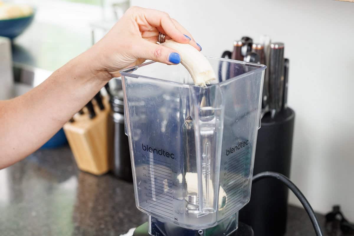 Step 1. Add all of your ingredients to your blender. Using a frozen banana require less ice!