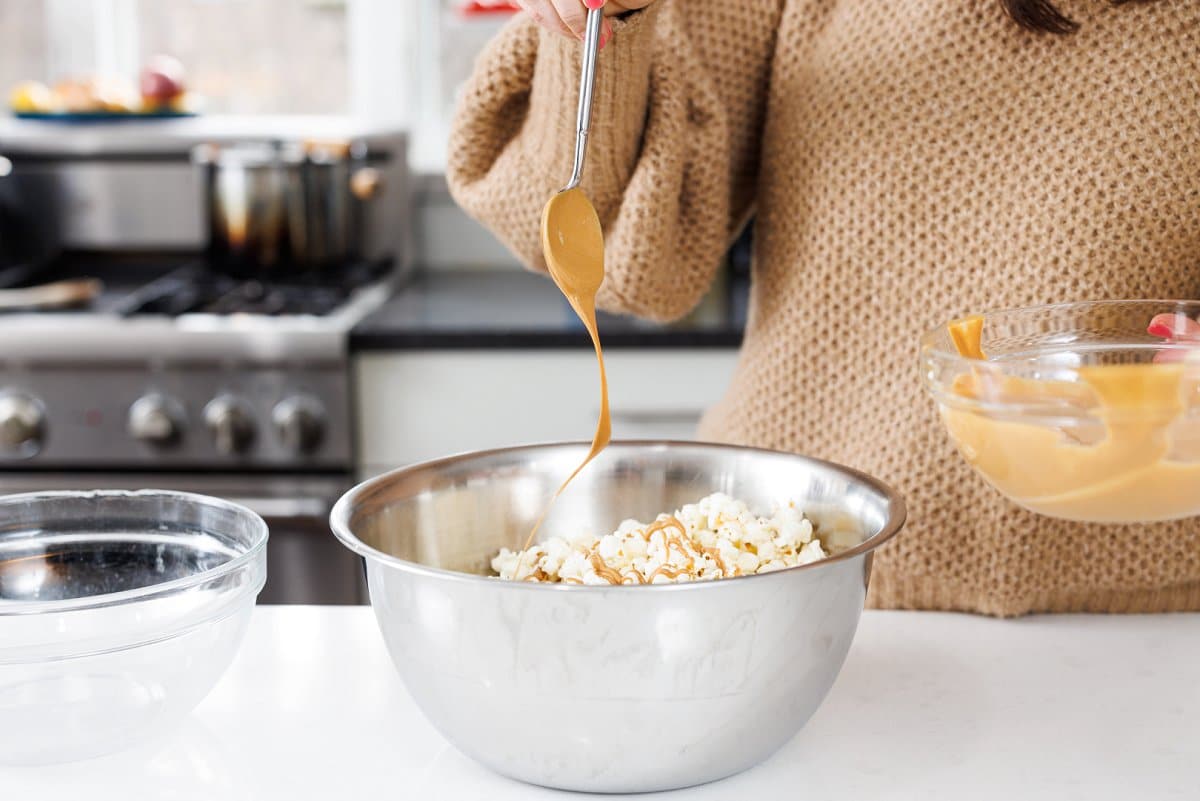 Put the peanut butter in a microwave safe bowl for about 30-40 seconds to melt it, then drizzle it over the top of the popcorn.