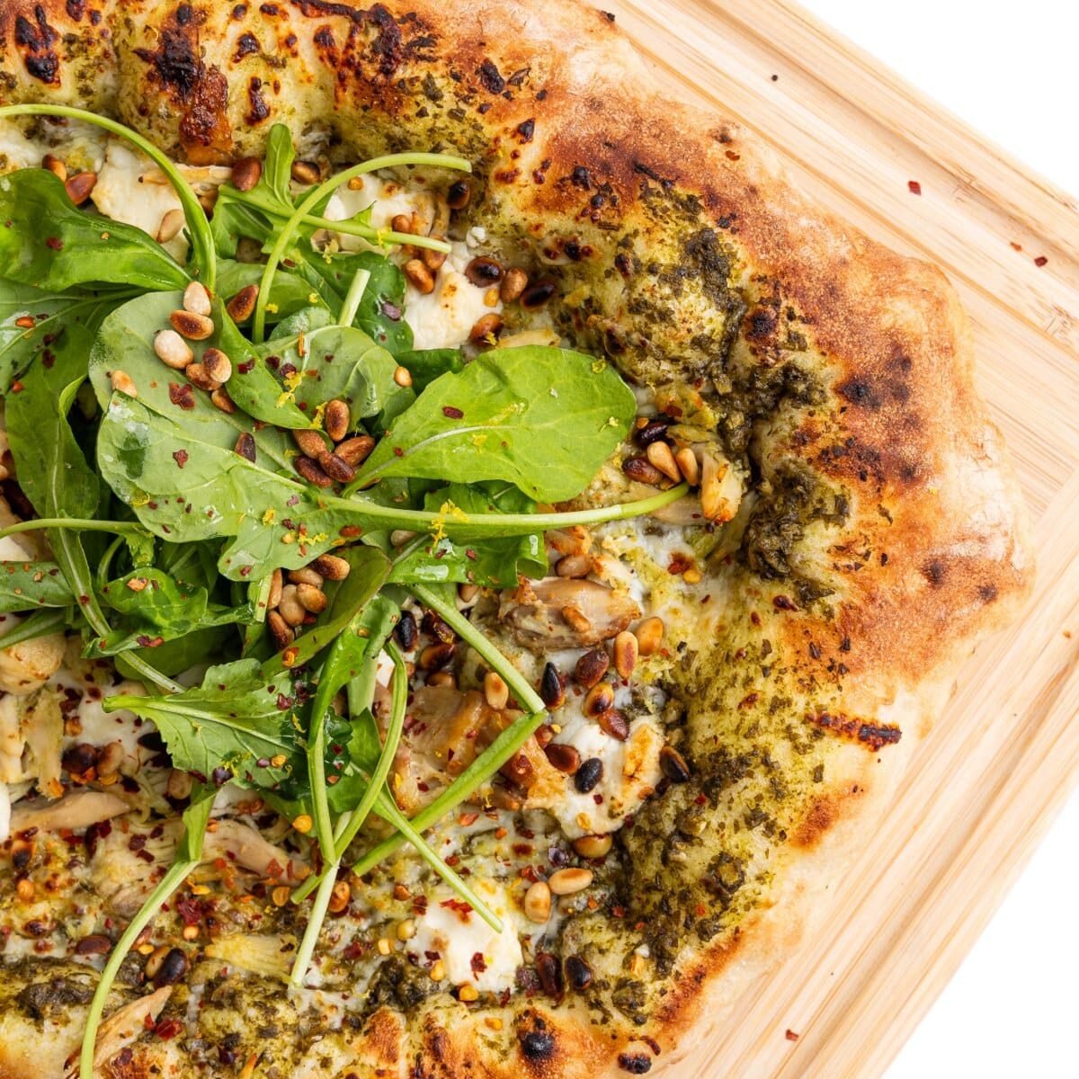 Top with fresh arugula, lemon zest, chili flakes, or shaved parmesan. Then serve and enjoy your Pesto Chicken Pizza with Goat Cheese and Toasted Pine Nuts.