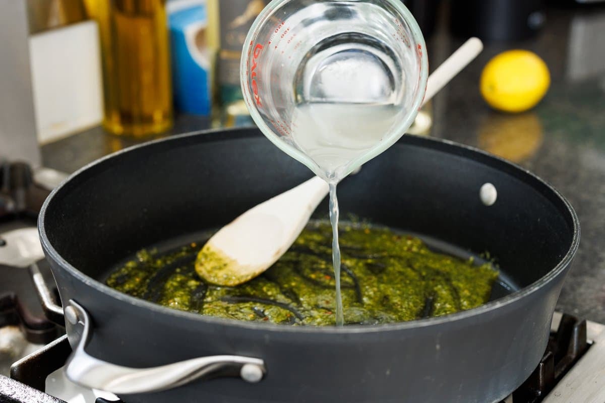 - In large, deep skillet, heat olive oil over medium heat then remaining 1/4 cup pesto and chili flakes. Heat until warmed through, about 1-2 minutes, before stirring in 1/2 cup of the starchy pasta water (reserving the rest in case you need it later.)