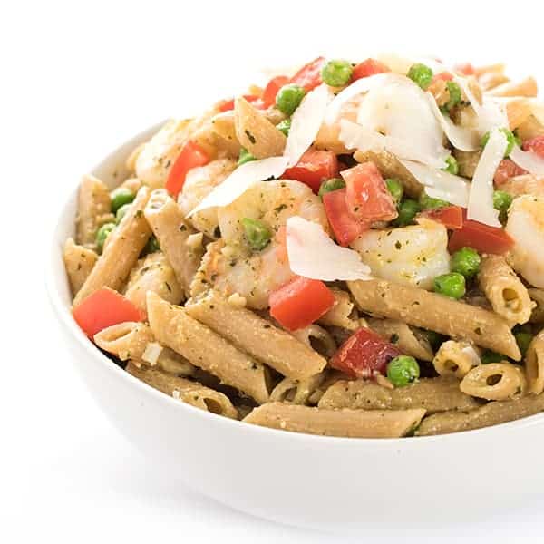 A quick and easy dinner recipe, this pesto pasta with shrimp and peas comes together in just 15 minutes!