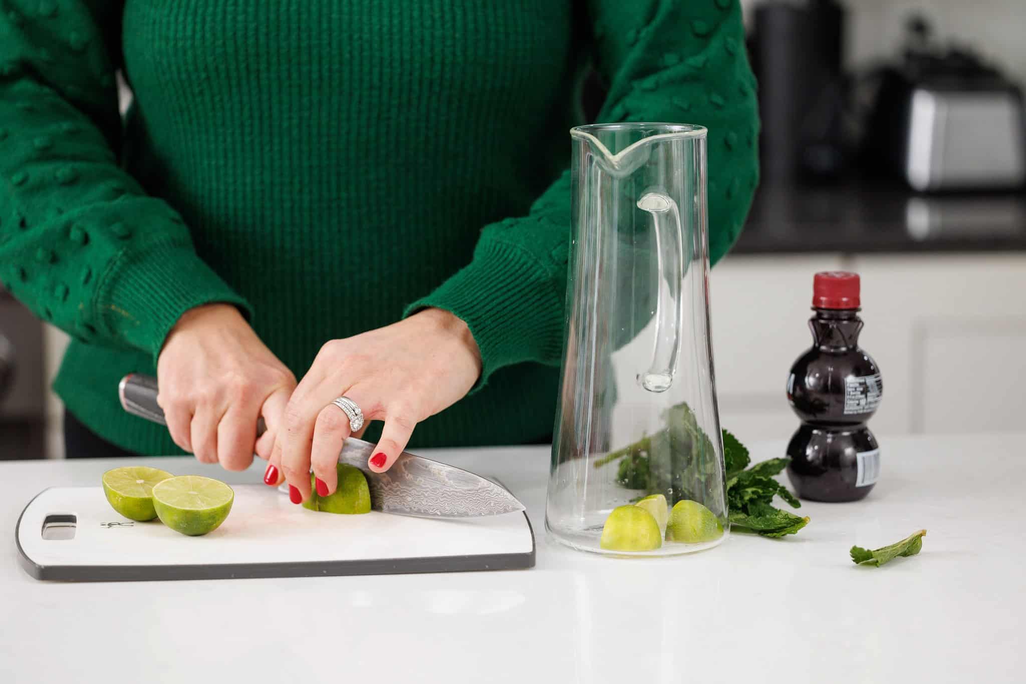 Start your Pomegranate Moscow Mule by cutting your limes into wedges and adding them to a tall pitcher or cocktail shaker. Then add your fresh mint sprigs.