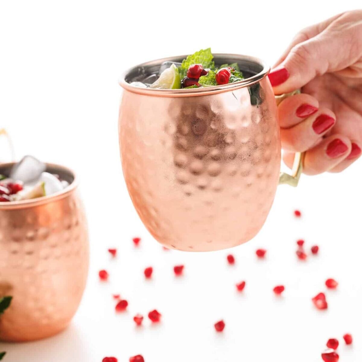 Garnish with pomegranate seeds, mint, and lime wedges, then serve and enjoy your Pomegranate Moscow Mules! Check out my tutorial on how to cut a pomegranate if you haven’t done so before!