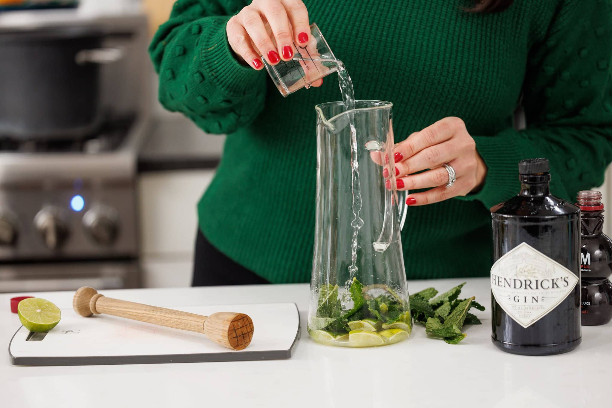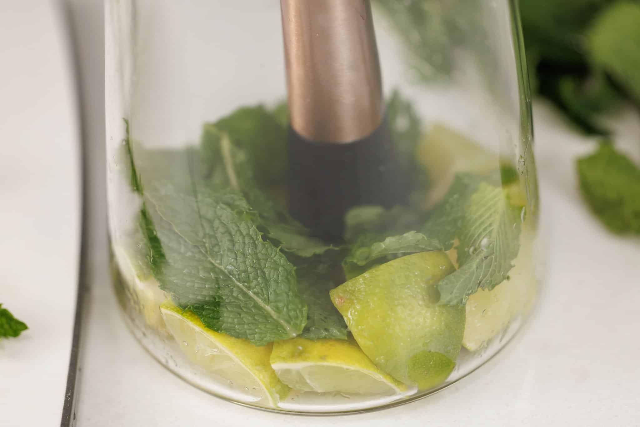 Then using a muddler or the end of a wooden spoon, muddle the mint and lime wedges to release all of the natural oils and flavor.