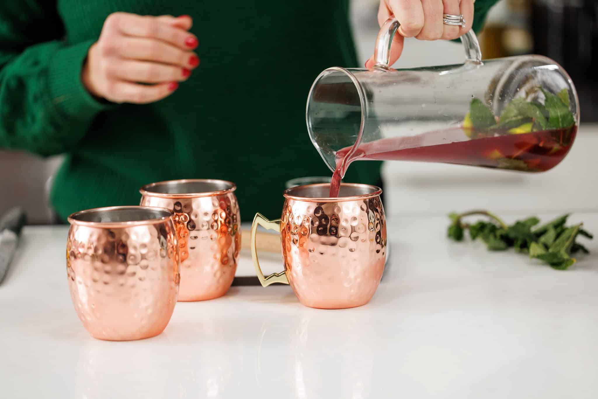 Next take your copper mugs filled with ice and pour the pomegranate mixture evenly into each.