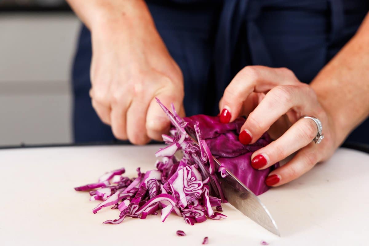 Step 3. While the pork is cooking, make your cabbage slaw by shredding your cabbage, slicing your red onion, and mincing the cilantro.