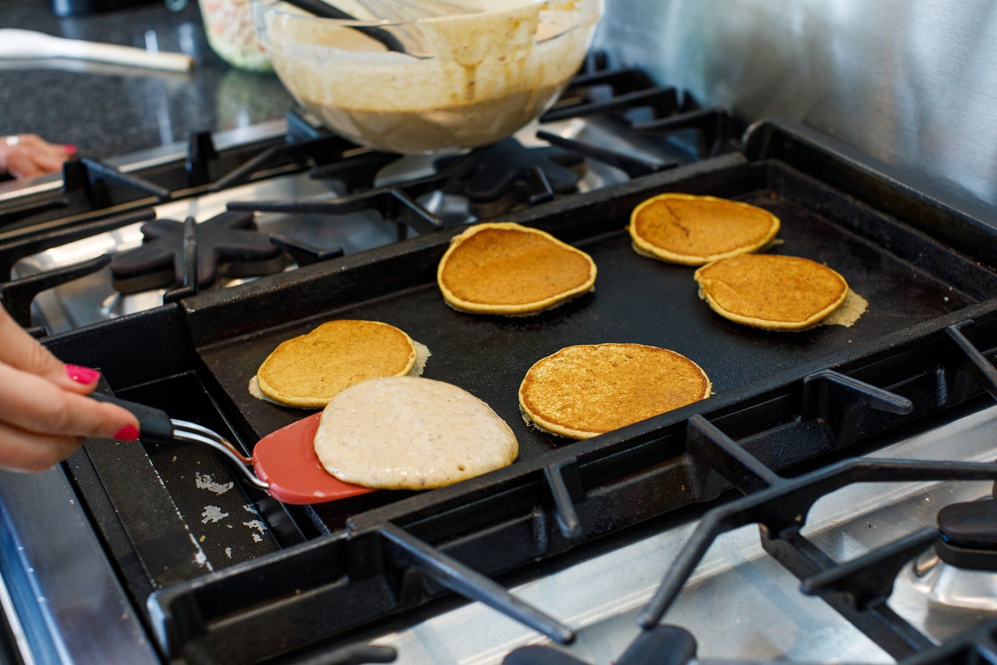 This pancake griddle is my secret weapon when it comes to making perfectly fluffy pancakes every time! In addition, it is important to mix all wet and dry ingredients separately. However, be careful not to over-mix your ingredients. You want them just combined, not completely blended. Otherwise, your pancakes will be flat and sad.