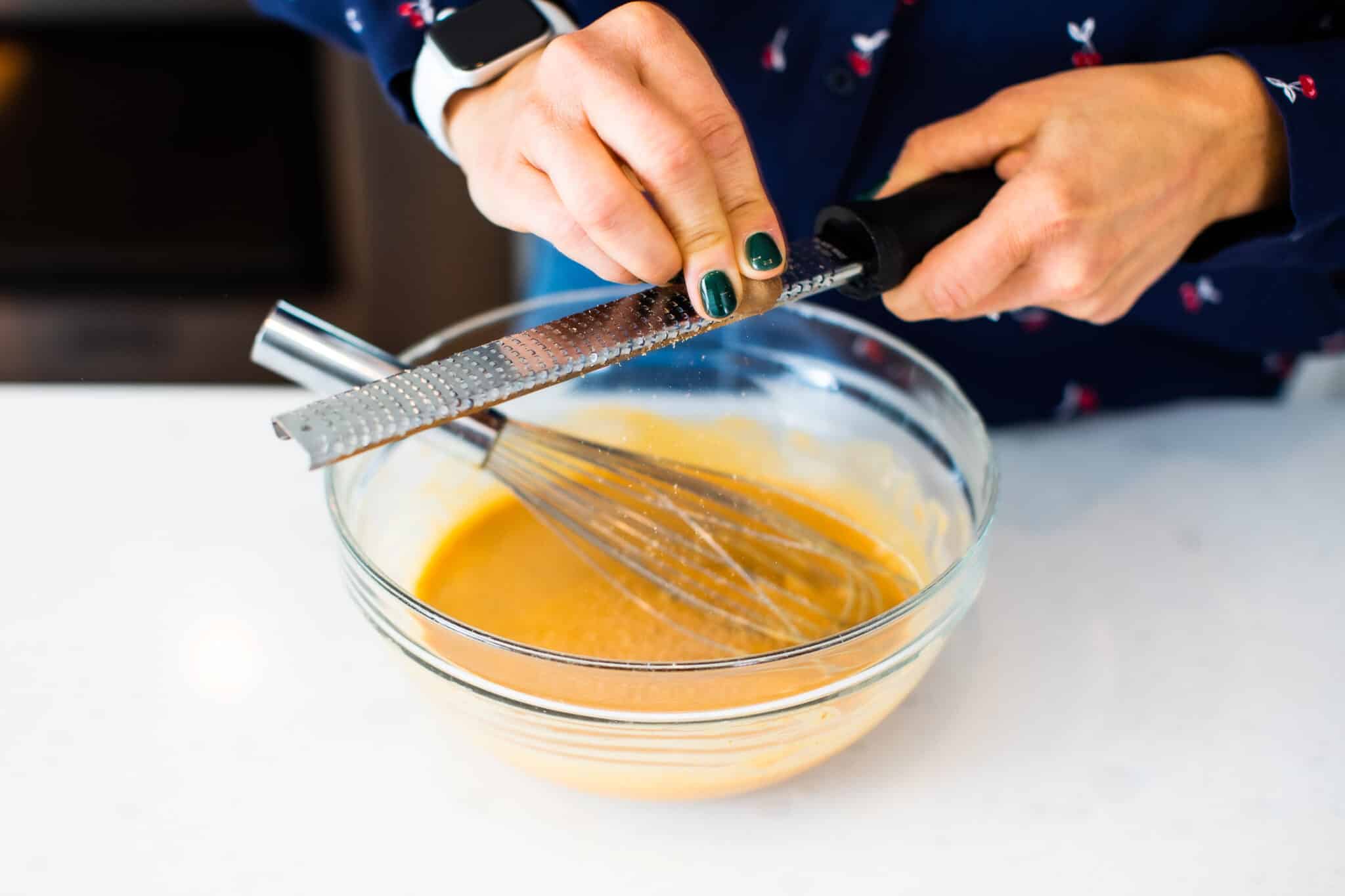 Start your pumpkin pie chia seed pudding by whisking your coconut milk and pur pumpkin in a large bowl. Then add the cinnamon, nutmeg, and ginger. I use a microplane to freshly grate my nutmeg.