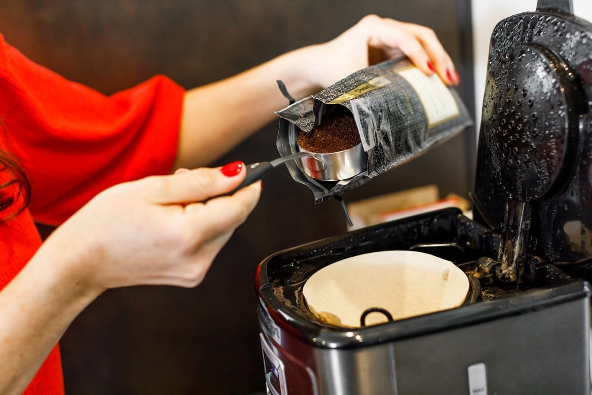 I recommend doubling the normal amount. For example, if you’re brewing 4 cups of coffee I would use 1/2 cup ground coffee and 4 cups of water.