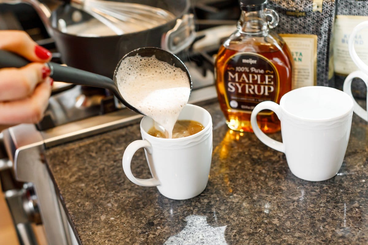 - While the coffee is brewing, whisk together pumpkin pie spice, maple syrup, vanilla and milk in a small sauce pot over medium heat. Continue whisking until bubbles start to form around the edges.