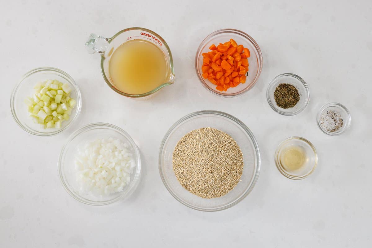 - Olive oil: A heart healthy oil used to sauté the veggies and toast the dry quinoa.