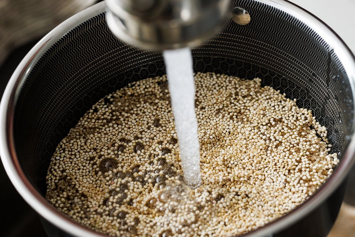 - In a medium saucepan, cover quinoa in water and allow it to soak for 5 minutes. Stir quinoa and pour into a strainer, rinse with cool water.