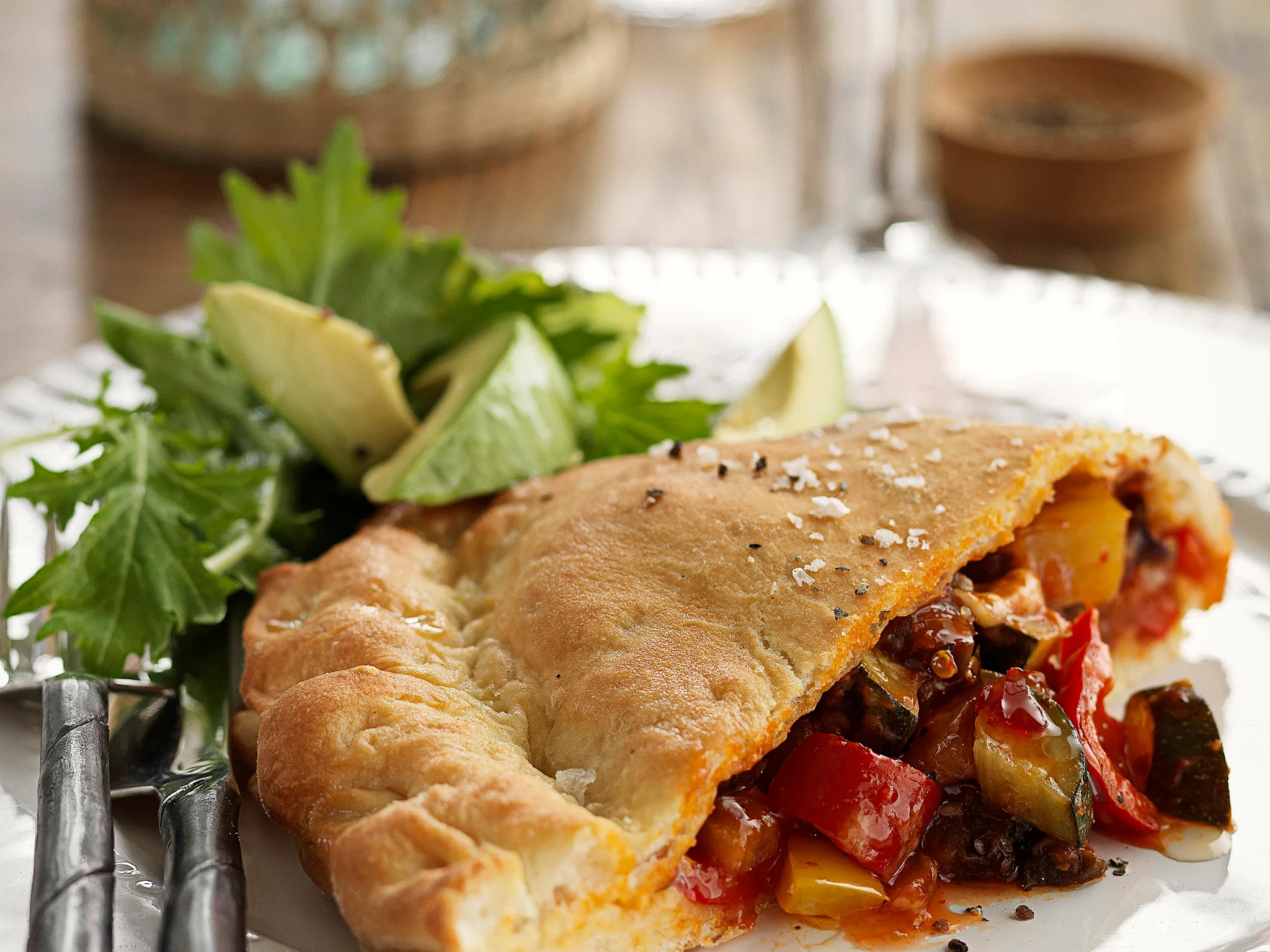 4.Fold over the uncovered side to enclose the filling and crimp the edges with your fingertips. Sprinkle with sea salt and pepper and bake for 25-30 minutes until golden and puffed. Serve with avocado and fresh greens.