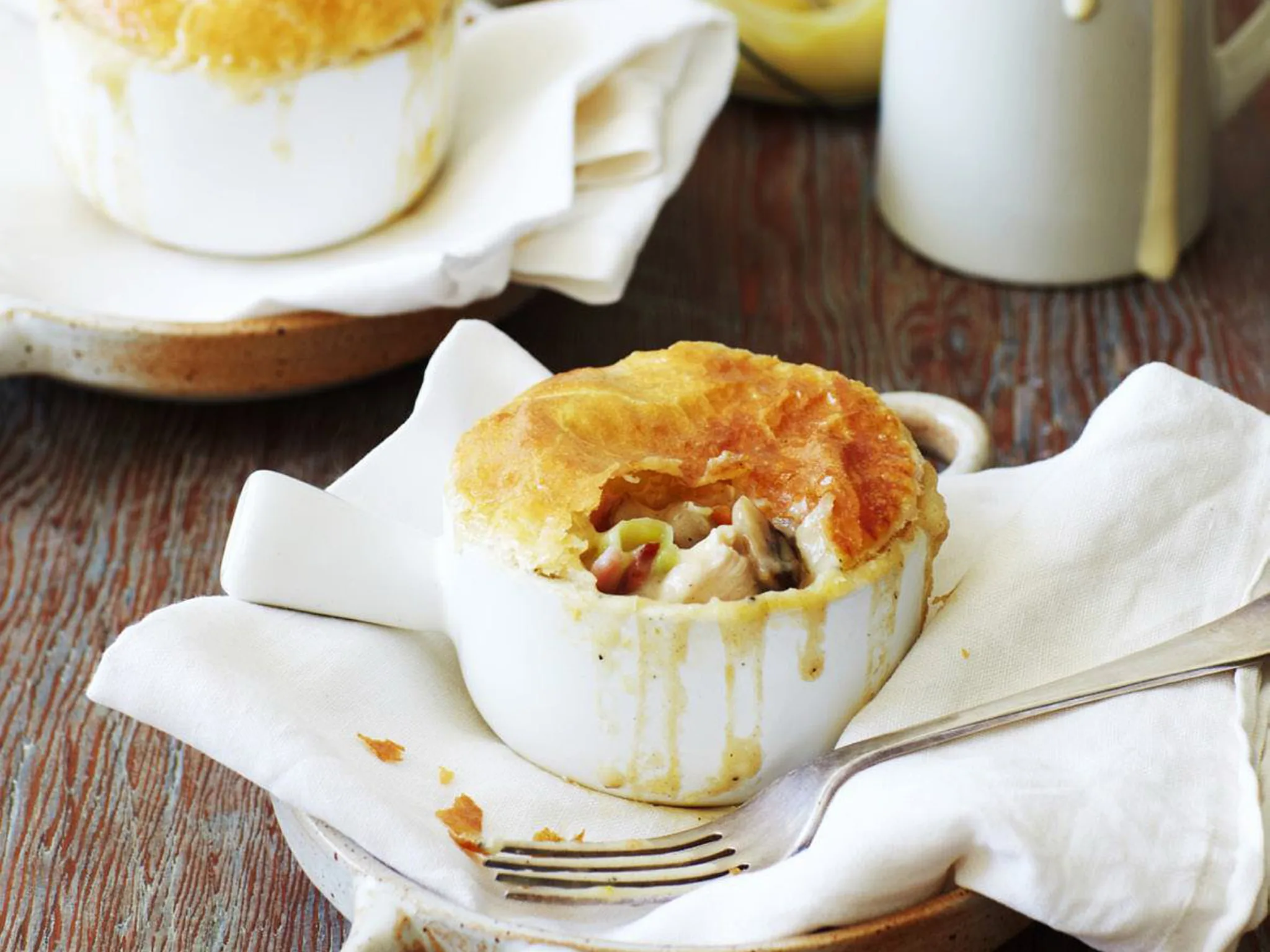 7.Divide chicken mixture among 4 x 1 1/4-cup (310ml) capacity ovenproof dishes. Cut pastry to fit tops of dishes and slightly overlap. Brush pastry with milk; place an extra mushroom on top of each pastry square.