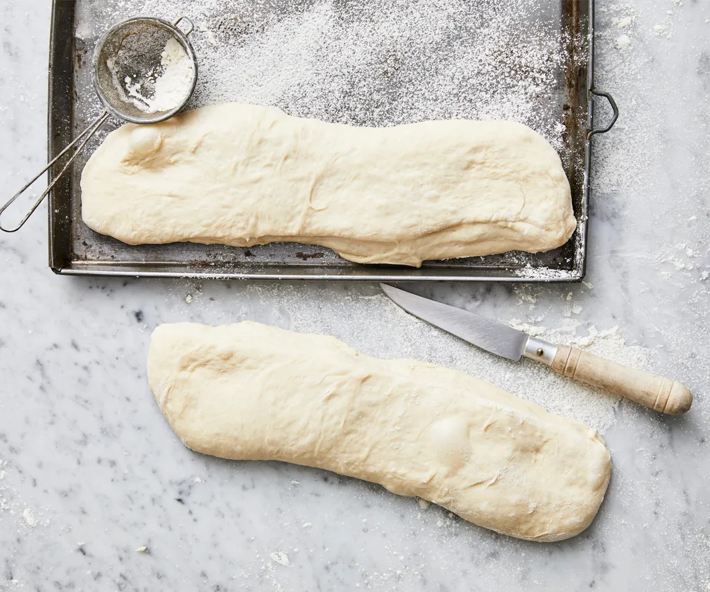 air bubbles. If dough sticks to your fingers, moisten lightly with water or dust with flour. Gently place hands under dough from each end and lift onto a floured baking tray. This is a very soft dough; do this in one quick, gentle motion. Repeat with remaining dough. Dust with the extra flour. Stand loaves, uncovered, in a warm place for 2-2½ hours or until doubled in size and full of air bubbles.