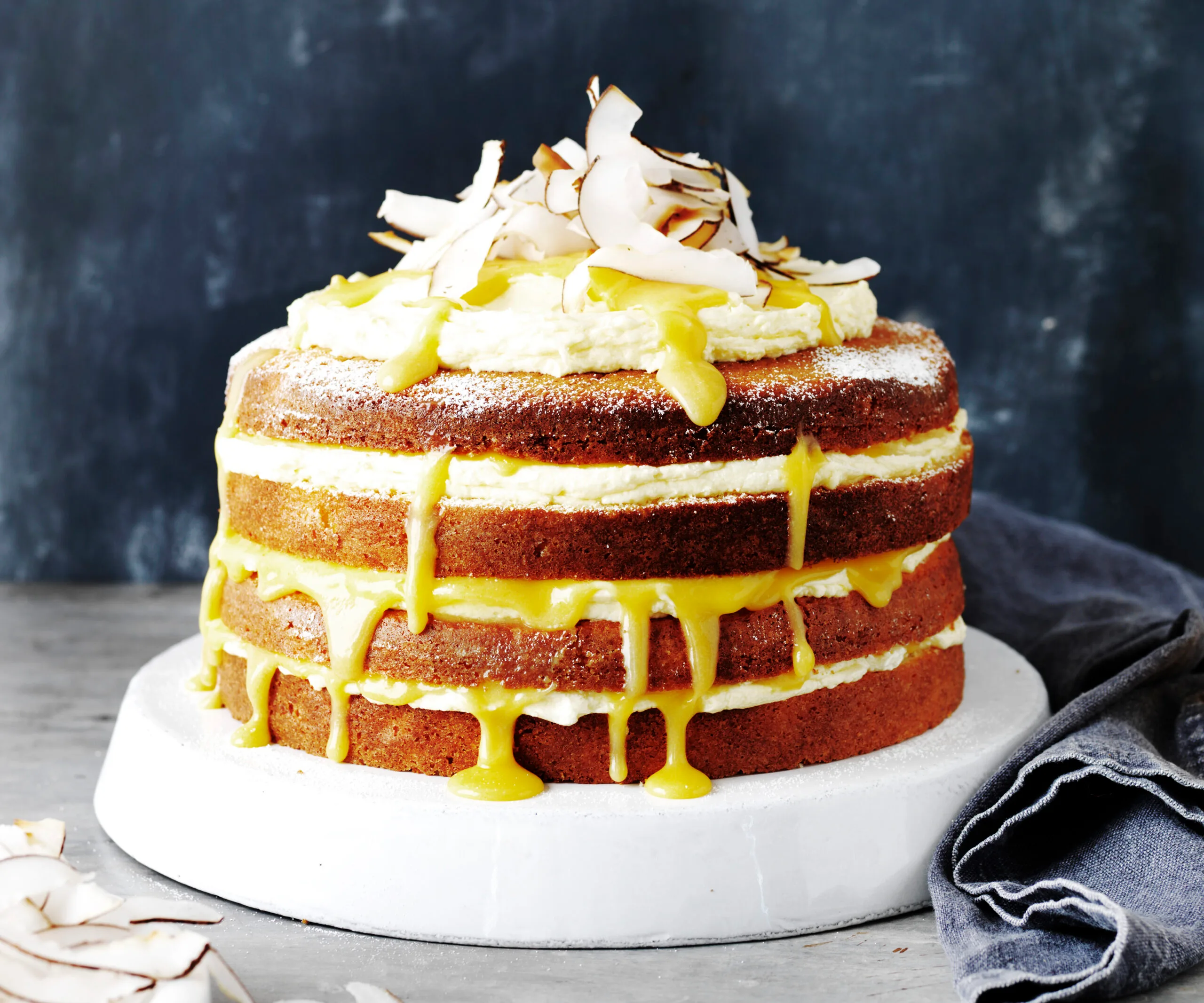 6.Trim tops of cakes to level, if needed. Split cakes in half. Place one cake layer on a plate or stand. Spread cake layer with a quarter of the cream cheese filling and a quarter of the lemon curd. Repeat layering with remaining cakes, filling and curd, finishing with curd. Dust with sifted icing sugar. Top with toasted coconut.