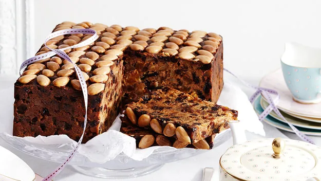 7.Spread mixture into pan, top with blanched almonds. Bake about 3 hours 30 minutes. Brush the top of hot cake with extra liqueur, cover with foil; cool in pan overnight.