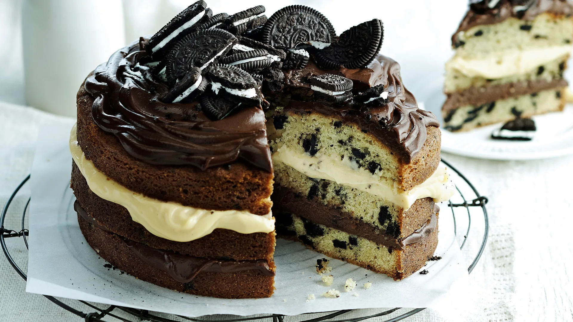 This oreo cake is coated head to toe in mouth-watering chocolatey cream, and finished with crumbled cookies.